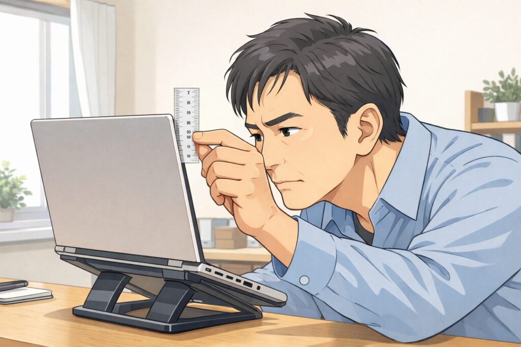 厚労省のガイドラインを参考にしつつ、私の首が一番楽になった『40代の黄金比』です。BoYataのヒンジは固いので、3年経ってもこのミリ単位の調整がピタッと止まります。