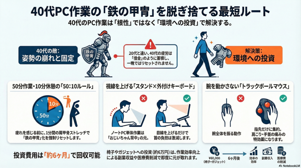 結論:40代のPC作業改善は「椅子」から始めてはいけない
